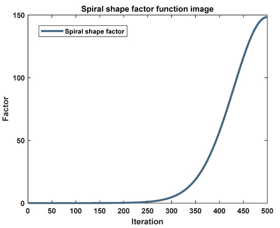 The graphical representation of the novel spiral shape factor is illustrated in Figure 9. Observations reveal that this factor exhibits a positive correlation with the iteration count. Specifically, the spiral shape factor maintains a relatively stable value prior to the iteration threshold of 250, an attribute that facilitates a broad search for prey during the initial phase and bolsters the algorithm’s capacity to identify the optimal solution. Upon surpassing this iteration landmark, the solution undergoes global optimization. This is characterized by a marked escalation in the factor’s value, which amplifies the interval of the whale’s helix indentation, thereby abbreviating the timeframe to ensnare the optimal solution. Consequently, this amendment expedites the convergence velocity. The refinement of the spiral shape coefficient not only heightens the optimization precision and velocity but also elevates the overall efficacy of the algorithm.