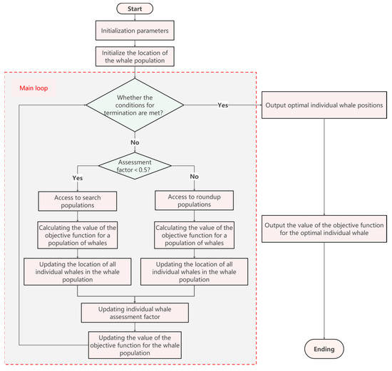 The enhanced Whale Optimization Algorithm, designated as MISWOA, is schematically represented in Figure 11. This algorithm initiates with a population that is stochastically generated and subsequently bifurcated into two distinct sub-populations. Further refinements to the algorithm are executed to ensure congruence with the authentic predatory strategies employed by humpback whales, achieved through the integration of an advanced strategic framework.