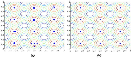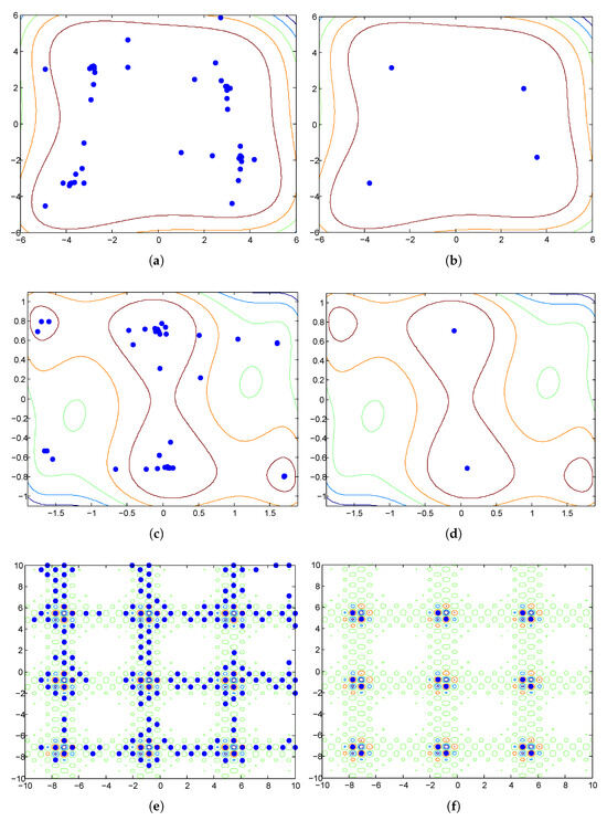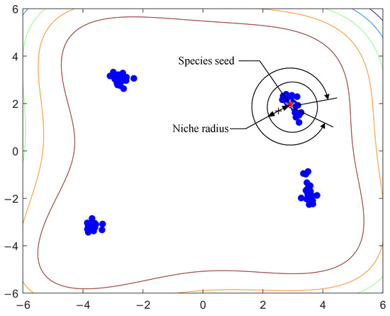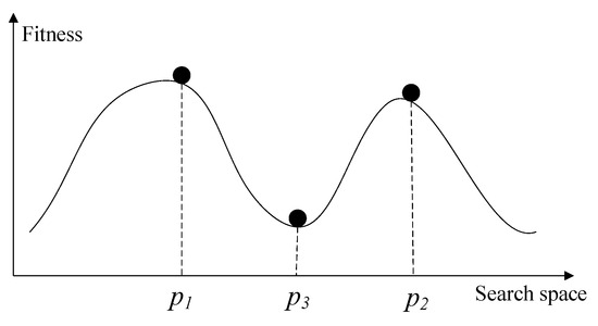 A promising approach to multimodal optimization is bio-inspired optimization algorithms, which are population-based metaheuristics inspired by natural processes [1,2,3,4]. These algorithms have been successfully applied to various search and optimization tasks [5,6,7,8]. Evolutionary algorithms (EAs) represent a prominent branch of bio-inspired optimization algorithms [9,10]. Traditionally, the population of an EA will converge to a single solution, with the final output being the best solution found. Nevertheless, the intrinsic parallelism of EAs suggests that they should be able to simultaneously locate multiple optima for a multimodal problem. Over the years, a number of studies have been performed on the use of EAs to tackle multimodal optimization problems. The techniques developed are commonly referred to as “niching” [11,12], which preserve multiple stable niches and prevent global convergence to a single solution. Some prominent niching techniques include crowding [13,14], fitness sharing [15], restricted tournament selection [16], and species conserving [17]. Species are formed within basins of attraction using these niching techniques. According to whether the species are maintained explicitly, niching techniques can be divided into two categories, explicit niching and implicit niching techniques. Explicit niching techniques divide the population into subpopulations using radius-based methods [18,19], topology-based methods [20,21], or clustering methods [22,23]. In comparison, implicit niching uses a mechanism that facilitates the maintenance of population diversity. Species are formed automatically after several successive iterations using implicit niching techniques. Some recently proposed multimodal optimization algorithms [24,25,26] fall into this category.