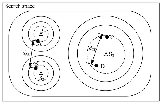 Here, we illustrate the challenges in finding the right setting for the niche radius. As long as the niche radius is set to less than the distance between the two closest optima, individuals in two different niches can be well separated. On the other hand, if the niche radius is set too small, there is a danger that individuals in the same niche will be regarded as being in two species. This situation occurs when the regions of attraction are of different shapes or sizes. Figure 3 gives an example to illustrate the situation. In Figure 3, there are three niches and four individuals. The stars (, , and ) are used to denote the peaks and the solid points (A, B, C, and D) are used to represent the individuals. Two individuals are located in the niches on the left, and the other two are located in the niche on the right. Suppose that the distance between A and B is and the distance between C and D is . We assume that the fitness values of the individuals have reached the required accuracy level. To separate A and B, the niche radius must be smaller than . On the other hand, to join C and D, the niche radius must be larger than . The fact that is larger than leads to a dilemma when setting the niche radius.