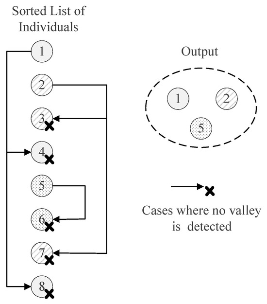 To further aid comprehension, a diagram that visually represents the flow of operations within the HVPI algorithm is depicted in Figure 7. The algorithm accepts a list of individuals, , arranged in order of their fitness values. It starts with the first individual, , and subsequently evaluates the presence of a valley between and each subsequent individual in the list using the hill–valley approach. If no valley is found between and another individual, such as , the algorithm concludes that these individuals belong to the same niche. As shown in the diagram, no valley is detected between and , so is considered redundant and removed from . The same logic applies to individual . After the initial assessment, is extracted from and added to the solution set S. This procedure is repeated iteratively for the remaining individuals in . In the end, the HVPI algorithm produces a solution set S that consists of non-redundant, optimally diverse individuals.