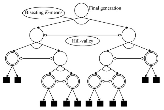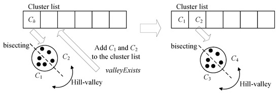 The input of the HVPIC algorithm includes the final generation and a user-specified accuracy level. No problem-specific knowledge is required. The fitness value of the best individual is adopted as an estimated value of the peak height, as suggested in [34]. HVPIC maintains a solution list and a cluster list. The solution list is initially empty, whereas the cluster list contains a single cluster consisting of all the individuals in the population. In each iteration, the cluster at the head of the list is removed. Two new clusters ( and ) are generated by applying K-means to . Subsequently, the hill–valley approach is applied to check whether the representative individual (best individual) in lies in the same niche as the one in . If the answer is yes, then it is considered that all the individuals in are in the same niche. Therefore, the best individual in is added to the solution list. Otherwise, and are added to the head of the cluster list for further division, as depicted in Figure 8. The above process is repeated until the cluster list is empty. Algorithm 5 gives the detailed procedures of HVPIC.