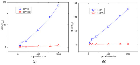 Number of consumed FEs per optimum versus population size. (a) (3D) (b) (3D).