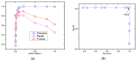 The HVPI and HVPIC algorithms reached the maximum F value when the MaxFEs were set to 25,000, 50,000, and 100,000. They had a consistent performance with different degrees of convergence. The results obtained by PL were worse than that of HVPI and HVPIC. The low recall values of PL were probably due to incorrect setting of the niche radius. Figure 15 shows the effect of the niche radius r. The use of a large niche radius tends to clear more redundant individuals in the population, so the precision increases as the niche radius increases. However, there is a danger that it will also eliminate possible optima near a species seed. Hence, the recall will correspondingly drop as the niche radius grows, as illustrated in Figure 15a. The recall versus precision is plotted in Figure 15b. There was only one setting of niche radius that gave the best compromise between precision and recall. It can be seen that the precision decreased rapidly if the niche radius was set to less than 0.2. Conversely, the recall dropped significantly if the niche radius was greater than 0.2. This indicates the difficulty in choosing a suitable niche radius.