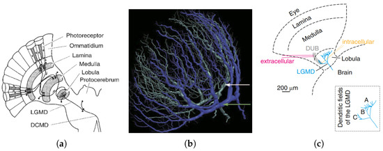 Figure 1. Neuromorphology of LGMD1 and LGMD2: (a) the presynaptic neuropile layers of the LGMD neuron and its postsynaptic one-to-one target, the DCMD neuron, image courtesy of [26]; (b) a 3D reconstruction of the dendritic trees of LGMD1 and LGMD2, indicated by white and green arrows, respectively, adapted from [27]; (c) the schematics of the locust’s optic lobe, where the inset illustrates the three dendritic fields of the LGMD, image courtesy of [22].
