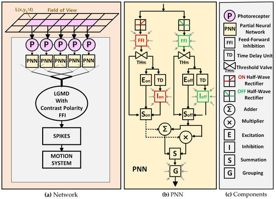 Figure 2. Illustrations of the optimized-LGMD neural network model: (a) the fundamental network structure of the model; (b) the detailed construction within each partial neural network (PNN); (c) the detail components.