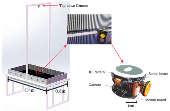To evaluate the basic collision detection capabilities of the proposed framework and compare to related bio-inspired algorithms, an arena measuring 140 × 80 cm2 was built. The arena is enclosed by 15 cm high walls and illuminated uniformly from top to bottom. Top-down cameras were installed to track and record the micro-robot’s performance with overtime trajectories. As illustrated in Figure 3, the arena walls feature a distinct black and white grating pattern, and the Colias robot is equipped with ID-specific patterns on top to implement a real-time localization system [64]. This system assists us to record the robot’s trajectory and calculates the success ratio (SR) of collision detection.