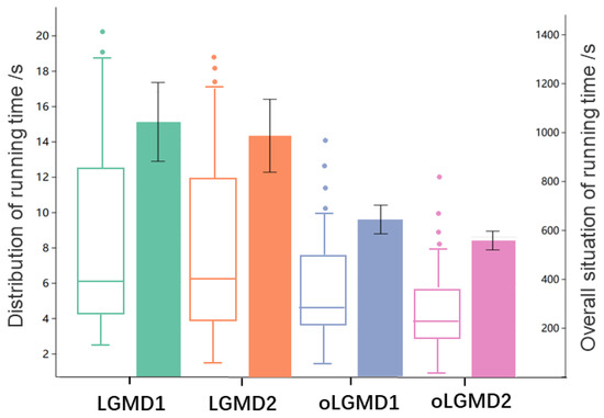 Figure 12. This figure presents data grouped into four sets corresponding to LGMD1, LGMD2, oLGMD1, and oLGMD2. Each is analyzed at two feature dimensions: (1) Box-and-whisker plot illustrates the distribution of the model’s required run times across all collision events of varying lengths. It highlights the individual characteristics of the run times, including the median, quartiles, and potential outliers. (2) Error bar graph displays the overall characteristics of the run times, with the error bars representing the range of variability across the experiments. The error bars indicate the uncertainty or variability in the model’s integrated processing times across all collision events. Both features represent data over a variety of experiments, providing a comprehensive view of the computational efficiency of each comparative model. Our proposed oLGMD model halves the processing time, showing a smaller variance.