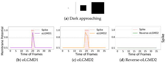 Figure 13. Illustrations of the responses of three collision selective models to dark approaching stimulation: the results indicate that both oLGMD1 and oLGMD2 generate collision warnings in response to the dark approaching stimulus, whereas reverse-oLGMD2 remains unresponsive.