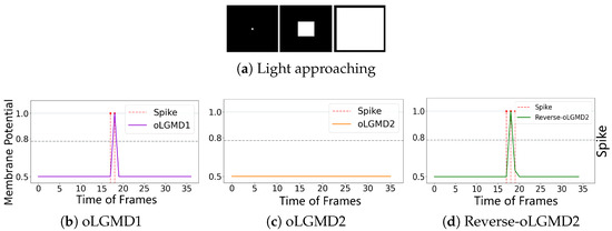 Figure 14. Illustrations of the responses of three collision selective models to light approaching stimulation: the results indicate that both oLGMD1 and reverse-oLGMD2 issue collision warnings in response to the light approaching stimulus, whereas oLGMD2 remains unresponsive. oLGMD2 and reverse-oLGMD2 models have the opposite looming selectivities.