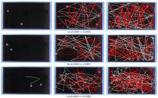 Figure 15. Illustrations of robot arena tests showing three processes with overtime trajectories: (a) oLGMD1 (white) vs. LGMD1 (red), (b) oLGMD2 (white) vs. LGMD2 (red), (c) oLGMD1 (white) vs. oLGMD2 (red). All Colias robots operated at a constant linear speed of approximately 0.04 m/s, with each process lasting 10 min.