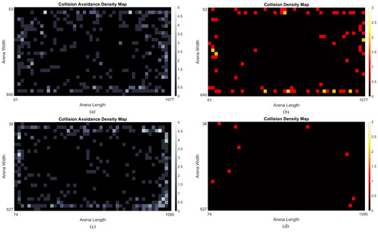 Figure 16. These density maps depict collision avoidance and crash events in the arena tests of the oLGMD model, with each model tested over a 30-min period. (a) oLGMD1 avoidance events, (b) oLGMD1 collision events, (c) oLGMD2 avoidance events, (d) oLGMD2 collision events.