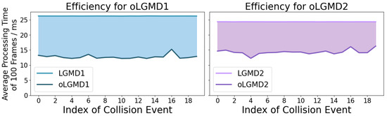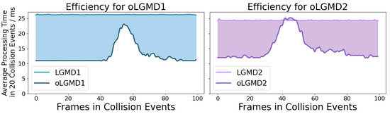 Figure 18. This figure compares the average time costs of oLGMD1 versus LGMD1 and oLGMD2 versus LGMD2 in response to 20 collision stimuli. Each visual movement consists of 100 frames, and the curves represent the average time measured across 20 repeated tests. The shaded area highlights the substantial improvement in computational efficiency of the oLGMD models. The oLGMD model significantly reduces processing time outside the collision time window, achieved through the ON/OFF FFI pathways.