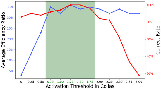 Figure 19. This figure illustrates the robot’s performance with varying activation thresholds in the ON/OFF FFI pathways by examining the computing efficiency ratio (ER, Equation (13)) and the success ratio (SR, Equation (14)) of collision detection. The horizontal axis represents different activation thresholds. The left vertical axis shows the average operational ER of the proposed model when subjected to a collision scenario to stimulate the Colias vision system. The right vertical axis indicates the collision detection SR under the same conditions. The collision process was repeated 50 times to calculate the average ER and SR. As the activation threshold increases, the oLGMD model processes progressively less visual information, leading to higher computational efficiency but a lower collision recognition rate. The green-shaded area represents the range of activation threshold values that effectively balances these two factors.