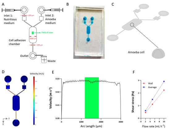 In this study, computational fluid dynamics (CFD) was used to simulate the hydrodynamic flow conditions within a cell adhesion chamber, with a specific focus on calculating the shear stress exerted on immobilized amoeba cells. The simulation was performed using simulation software (COMSOL Multiphysics 4.2a, Stockholm, Sweden). The simulation employed fluid–structure interaction to concurrently analyze the effect of fluid flow across the amoeba, under simplified cellular adhesion patterns on the solid surface. The model’s geometrical features the microfluidic system, including two inlets and one outlet, with amoebae being represented as solid semi-spherical objects with radii of 5 µm based on approximations from microscope imaging. We fixed the field of view at the center of the cell adhesion chamber (Figure 1) to avoid wall effects. A selection of important model properties is presented in Table 1.