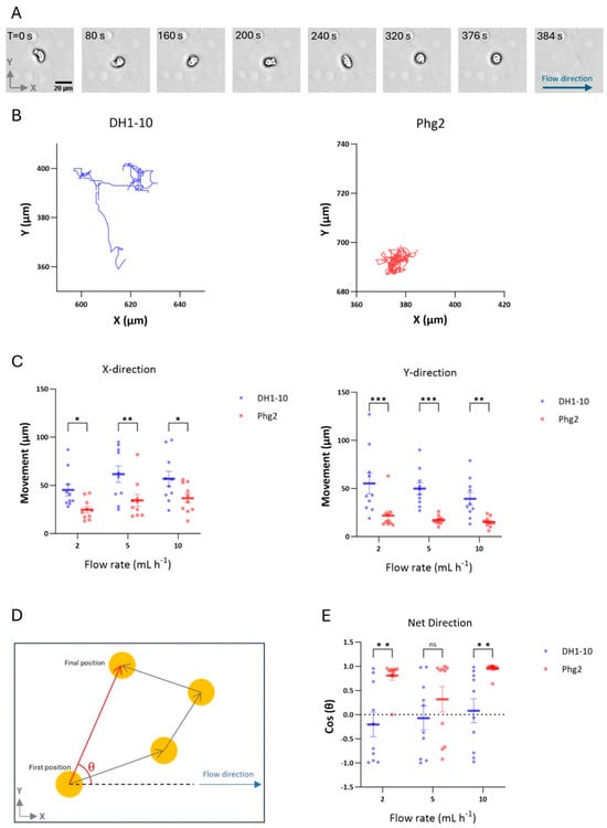 The directionality of net cell movement was further evaluated by measuring the angle between the initial (t = 0 min) and final cell positions (t = 40 min), as illustrated in Figure 2D. DH1-10 cells exhibited diffusive behavior, characterized by random movement within their environment, and maintained this diffusive pattern even under high shear stress (Figure 2E). In contrast, phg2 mutant cells demonstrated a movement predominantly aligned with the flow direction (X-direction), as indicated by Cos(θ) values close to 1 (Figure 2E) indicating a more pronounced response to the flow conditions. In contrast, movement distance in the X-direction was approximately equivalent for movement upstream compared to movement downstream for DH1-10 cells, indicating a motility that was nearly independent of the flow rate.