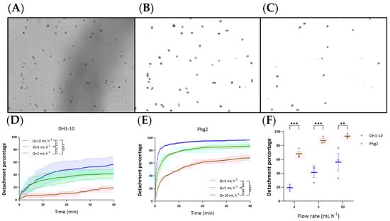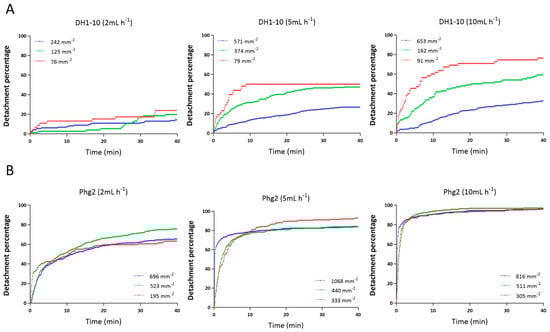 Upon investigating the data presented in Figure 5, we concluded that cell density can indeed affect detachment, but that this effect is dependent on cell type and flow rate. For example, DH1-10 wild-type cells (Figure 5A) did show a lower sensitivity to cell detachment when the initial cell densities were high. Unfortunately, the highest cell density for the 2 mL h−1 experiment was lower than for the others, so the data have a more pronounced appearance for higher flow rates. In contrast, for phg2 mutant cells, regardless of the initial cell density, the detachment behavior remained nearly consistent at 2 mL h−1, 5 mL h−1, and 10 mL h−1 (Figure 5B). This suggests that the reductions in applied shear stresses at high cell densities were not significant enough to impact the very weak adhesion arising from the phg2 mutation.