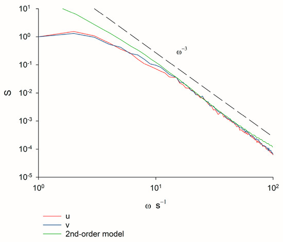 Velocity spectra, S, as a function of frequency, ω, obtained by analysis of pre-existing data for laboratory swarms of the non-biting midge Chironomus riparius. Results are shown for the largest swarm in the dataset of Sinhuber et al. [23], which on average contains 94 individuals. Results are shown for the two horizontal components of velocity. The spectra are seen to decrease as at the highest frequencies accessible in the experiment. Recordings were made at a rate of 100 Hz. The same scaling behaviour was obtained for smaller swarms. Shown for comparison is the velocity spectra predicted by a 2nd-order model with = , and a.u. (Appendix A).