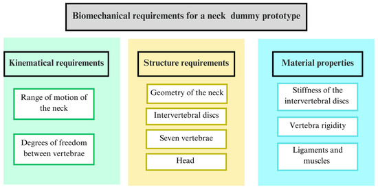To design a neck dummy, it is necessary to take into account aspects of the anatomy of the neck and the biomechanics of the cervical spine. Biomechanical requirements need to be considered in order to replicate the structure, geometry, and mobility of the cervical spine. They are described in the following section as those considered for the proposed design.