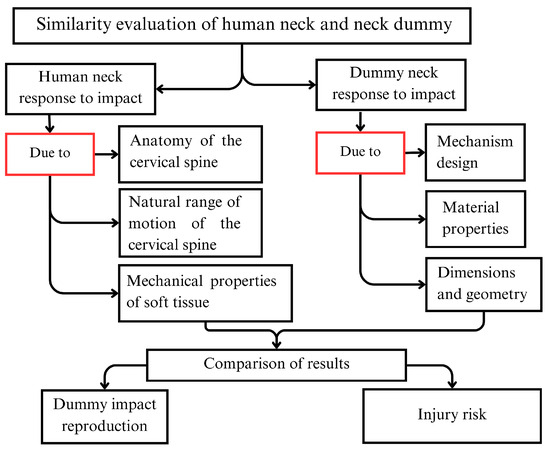 To assess the response of a neck dummy, prototype test data should be compared to human or cadaver test responses in order to evaluate the similarity between the prototype response and human neck behavior. The closer the response of a neck dummy is to that of the human, the more accurate the calculation of injury risk. The considerations for this comparison are summarized in the flow chart in