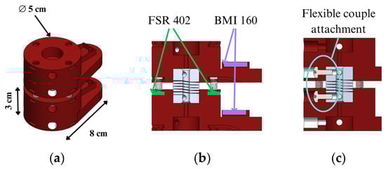 Figure 5a. In the upper and lower faces of vertebrae, there are five holes, with a central one to fix a flexible aluminum coupling simulating the intervertebral disc. Four more holes are arranged at 90 degrees to each other, in which metal springs and FSR402 resistive force sensors are housed. From the bottom of this, there is a protrusion that replicates the vertebra shape with a depth of 8 cm. This section houses a BMI160 IMU sensor on the surface to monitor the acceleration and displacement of the vertebra. The location of these sensors can be seen in