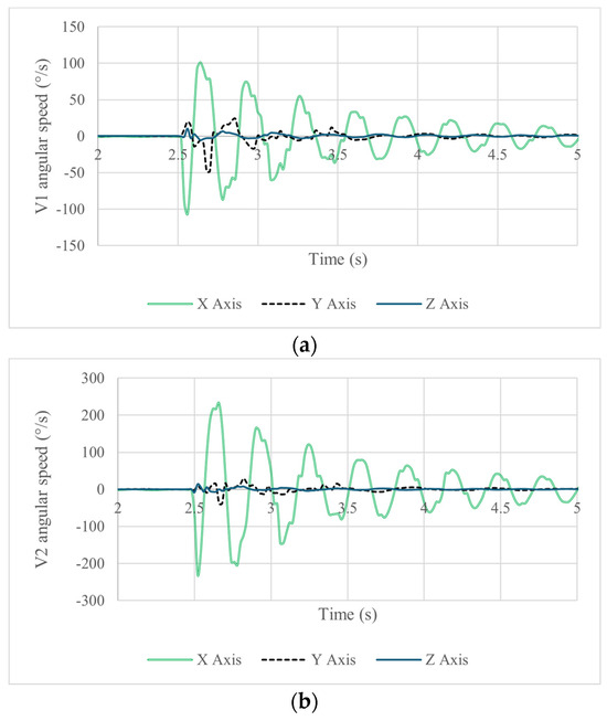 Figure 11 shows the acquired data in terms of angular velocity. The axis of main rotation is the X-axis due to the direction of impact shown in