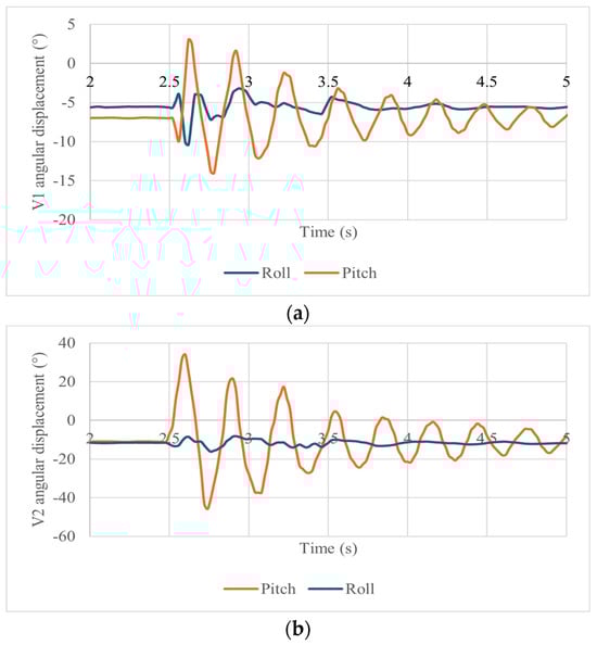 Figure 12a,b show the angular displacements of the vertebrae in terms of the Pitch and Roll angles. In
