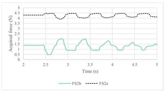 Figure 8, indicated as FS2a and FS2b, were monitored simultaneously to the IMU sensors. Considering the initial position of the prototype with a slight deviation to the front and the applied pressure due to the tension springs,