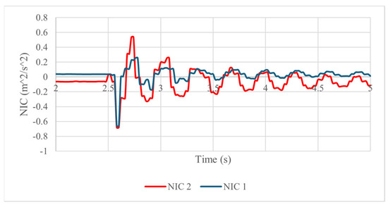 The results of all the tests demonstrate the feasibility of the proposed design and of the experiments conducted since they show that the prototype has the ability to replicate the neck’s response to an impact with results that are useful to predict the risk of injury. With the acquired data from the IMU sensors and force sensors, two neck injury criteria are computed to check the feasibility of the designed neck dummy and the testing layout in representing neck–head motion in impact with injury risk. The results of the NIC index using Equation (2) are summarized in