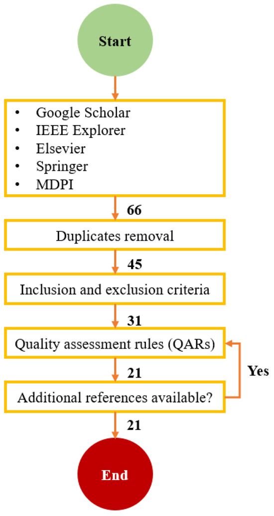 After the filtration steps, 21 research papers are selected for this SLR. These articles are recorded in Table A1 in Appendix A.