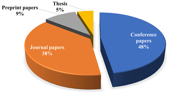In the final phase (the reporting phase), the research questions are answered based on the synthesized and extracted data from the 21 collected articles. Figure 3 displays a pie chart that provides the distribution of the collected articles in terms of conference, journal, preprint, and thesis papers. It is clear from the chart that the majority of the papers are journals, followed by conferences, then preprints, and finally one thesis report.