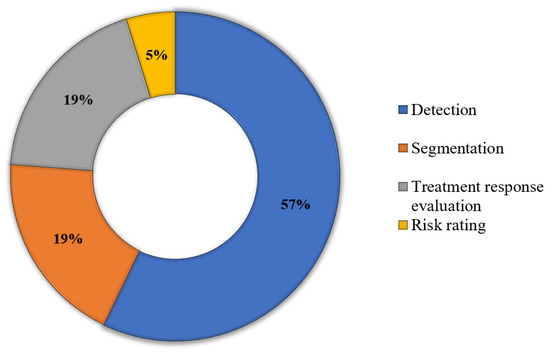 Figure 4 presents a doughnut chart specifying the percentages of each area in IH that has been tackled by the collected articles. It is clear that detection of IH is the most practiced area, holding a percentage of 57%, followed by segmentation of IH lesions and treatment response evaluation at 19% each, and risk rating is the least-practiced field with a percentage of 5%.