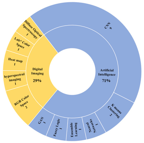 Artificial intelligence (AI) is the simulation of human intelligence processes by machines. It is divided into Machine Learning (ML) and Deep Learning (DL). As can be seen from Figure 5, the AI-based techniques utilized in IH represent 71% of the selected papers, where most of these employ Convolutional Neural Networks (CNNs). CNNs are a subcategory of DL where convolution is used to detect patterns in the input image. CNNs are designed to process structured data such as images, which justifies their application as the most-used technique because all IH applications depend heavily on patient images.