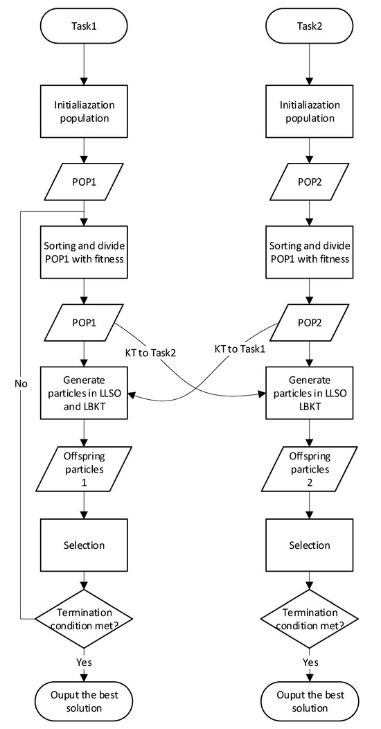 In MFPSO, when conducting knowledge transfer between different tasks, the transferred knowledge all comes from the global best solution of the source population (Figure 2). Although the global best solution of the source population contains more information, transferring the same particle would lead to a loss of diversity in knowledge transfer. Therefore, to enhance the diversity of knowledge transfer, we need to select different advantageous particles from the source population as transfer targets. The updating strategy of LLSO is applicable not only within populations but also between populations. Thus, we can adopt the same strategy in the source population and select two different particles with higher ranks than its own for learning in the population of the source task, thereby achieving the strategy of knowledge transfer, called LBKT. Taking an L3-level particle update as an example, if the particle meets the knowledge transfer condition, one particle each from the L1-level and L2-level of the source population is selected as the learning target, denoted as x′k1 and x′k2. Then, Equation (4) is used for updating. Otherwise, the LLSO strategy is used for updating within the target population. For more details, please refer to Algorithm 2.