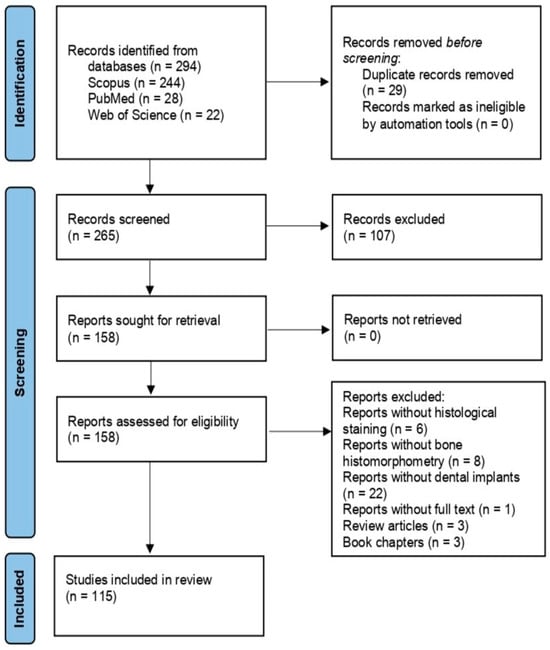- The keywords that were used in the Scopus database were: ((histology) OR (histomorphometry)) AND ((undecalcified) OR (non-decalcified)) AND (dental AND implant) AND (osseointegration) AND PUBYEAR > 2013 AND PUBYEAR < 2025 AND (LIMIT-TO (DOCTYPE, “ar”)) AND (LIMIT-TO (LANGUAGE, “English”)).