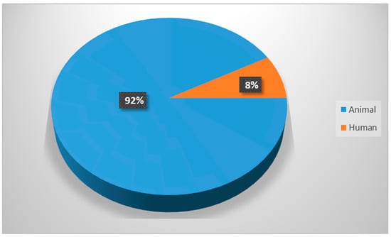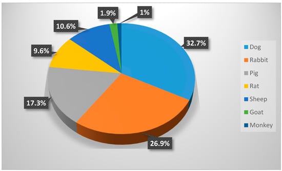 The study results demonstrated that most of the in vivo experiments utilized animal rather than human models (Figure 2), with dog, rabbit, and pig models being the most commonly used (in more than 70% of the cases), followed by rat, sheep, goat, and monkey models (Figure 3).