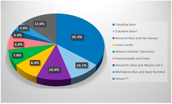 As for the staining methods, the most commonly used were toluidine blue (alone or with different counterstains), Stevenel blue with Van Gieson, and Levai–Laczko (Figure 4).