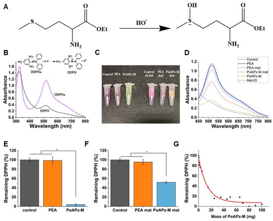 (A) The mechanism of L-Methionine derivative (L-Methionine ethyl ester) ROS scavenging. (B) The reaction of 2,2-diphenyl-1-picrylhydrazyl (DPPH) with an antioxidant. A-H = antioxidant radical scavenger; A● = antioxidant radical. (C) The DPPH solution (5 mg/100 mL, 1.5 mL) incubated with 100 mg of L-methionine, PEA, and PαAPz-M pellets, and 1 cm2 fiber mats for 2 h in the dark. (D) The absorbance of the corresponding solution after 2 h of incubation. The DPPH scavenging capacity of PEA and PαAPz-M pellets (E) and the corresponding fiber mats (F) based on absorption peaks at 510 nm. (G) The effect of PαAPz-M mass on DPPH scavenging. * p < 0.05.