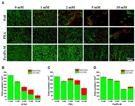 Evaluation of iMSC viabilities of fiber mats exposed to exogenous ROS. (A) Live/dead staining of iMSC cultured on each material for 5 days and treated with different concentrations of H2O2 for 2 h. Live cells are labeled in green and dead cells in red. The 200 µm scale bar shown on the PαAPz-M image at 10 mM is applicable to all images. Live and dead cell numbers per mm2 on Al foil (B), PEA mat (C), and PαAPz-M mat (D) based on live/dead staining.