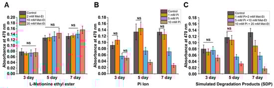 Cell viability of iMSCs cultured with media containing various concentrations of (A) Methionine, (B) Pi ion, and (C) simulated degradation product (SD) for 3–7 days, assessed using the MTT assay. After seeding the cells onto the culture plates, the additives were introduced to the media at the indicated concentrations. The stock solutions of each additive were prepared at concentrations of 1 M, with the pH adjusted to 7.4 post-preparation. The stock solutions were then diluted into the culture medium to achieve the desired target concentrations. Statistical significance was observed between groups, except for those labeled with “NS” (not significant).
