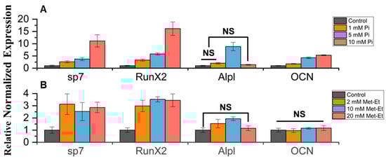 iMSC mRNA expression of SP7, RunX2, Alpl, and OCN was analyzed using RT-qPCR after cell treatment with (A) Pi ions and (B) Methionine for 7 days under 2D conventional tissue culture conditions. Differentiation was induced once the cells reached 80% confluence to ensure an adequate number of cells for differentiation. Within the indicated groups, statistical significance exists except for those labeled with NS (not significant).