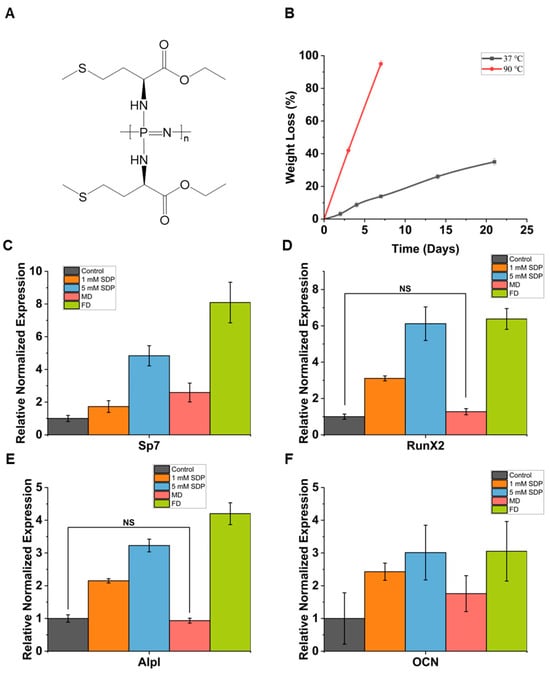 After studying the effects of Pi ions and L-methionine ethyl ester on cell viability and iMSC differentiation, the osteogenic differentiation of iMSC cultured on PαAPz-M fiber mats and treated with the staged degradation products of PαAPz-M was evaluated. Normally, the PαAPz-M fibers would degrade over time, releasing Pi ions and L-methionine derivatives to influence cell differentiation, but the L-methionine derivative in the PαAPz-M can protect cells from oxidative damage before polymer degradation (Figure 1 and Figure 2). In order to gain insight into the effect of the degradation products during short-term culture iMSC differentiation, we supplemented cultures with accelerated degradation products. As shown in Figure 5B, the PαAPz-M lost around 40% of its mass after 21 days of degradation at 37 °C, suggesting a slower degradation relative to the short cell culture time (7 days). However, PαAPz-M completely degraded at 90 °C in 7 days. We separately collected the mid-stage degradation (MD) soluble products, which occurred on day 4, and the full degradation (FD) soluble fraction, which happened on day 7. The degradation behavior based on the mass loss of PαAPz-M is very similar to previously reported trends, albeit with a slightly accelerated rate [39,40]. This difference could be attributed to the phosphazene polymerization method employed. The degradation products were added to the culture medium at 10 mM, based on the estimated phosphate-ion concentration derived from the mass loss of the material. iMSC, cultured on the PαAPz-M fiber mats, was used as a control. Furthermore, iMSC cultured on PαAPz-M fibers and treated with simulated degradation products (SDP) was used as an additional comparator.