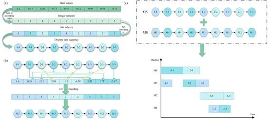 where represents the discrete values of the task sequence, represents the value in the integer sequence, n represents the total number of tasks, and p indicates the number of processes for each task. For example, suppose there are 3 tasks, each containing 3 processes, i.e., , . For real numbers , as shown in Figure 1a, first sort these real numbers in ascending order. For example, 0.12 is the smallest value and its rank is first, and so on, generating an integer sequence . Then, the integer sequence is processed according to the RK encoding scheme. Using the first value 3 in the sequence as an example, according to Formula (27), we calculate . Similarly, the calculation is performed for all integer values to eventually obtain the execution sequence for each process of every task.
