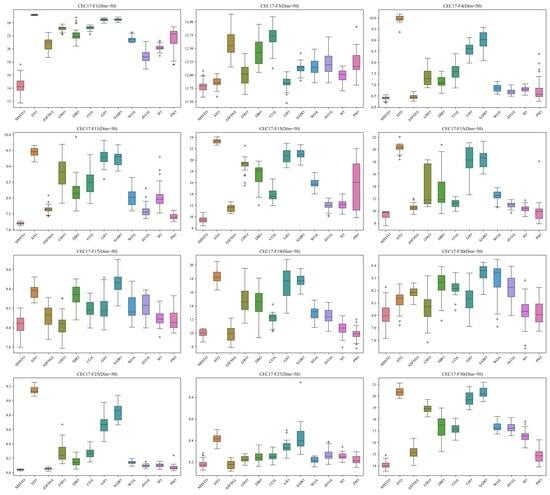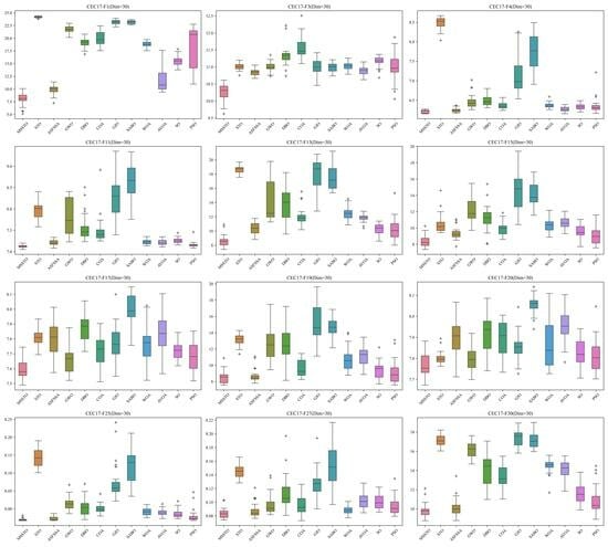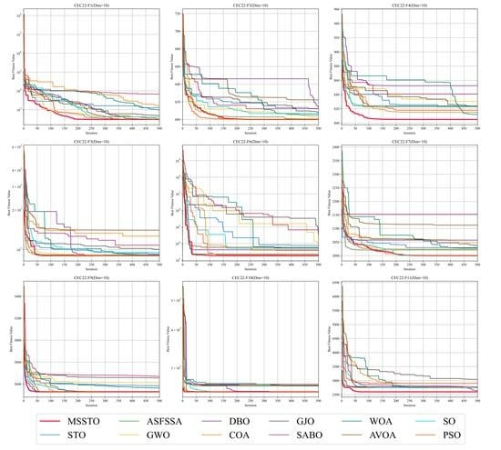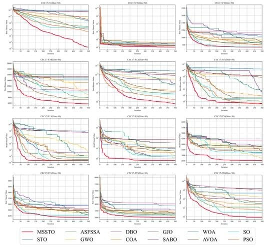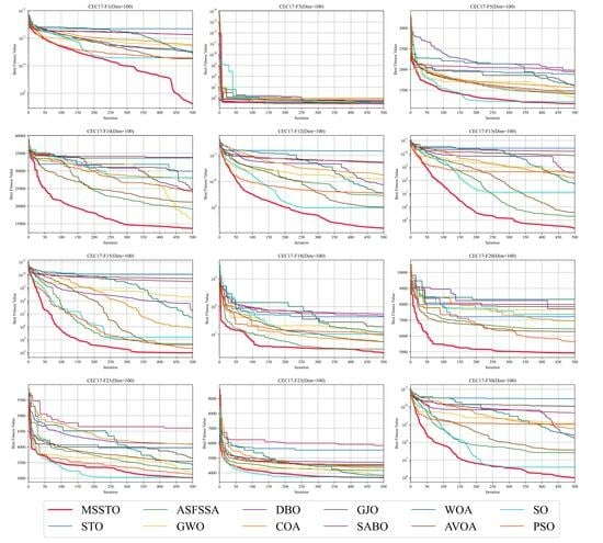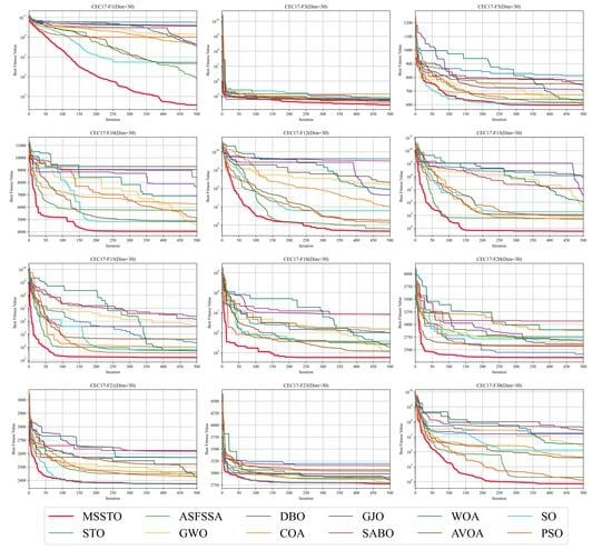 To thoroughly assess the performance of the MSSTO algorithm, this section employs the CEC-2017 test suite for comparative analysis. The CEC-2017 test suite consists of 29 objective functions. Specifically, C17-F1 to C17-F3 are unimodal functions, C17-F4 to C17-F10 are multimodal functions, C17-F11 to C17-F20 are hybrid functions, and C17-F21 to C17-F30 are composite functions. Note that C17-F2 has been excluded from the test suite due to its instability []. When evaluating the algorithms using the CEC-2017 test suite, this study conducted tests at 30, 50, and 100 dimensions.