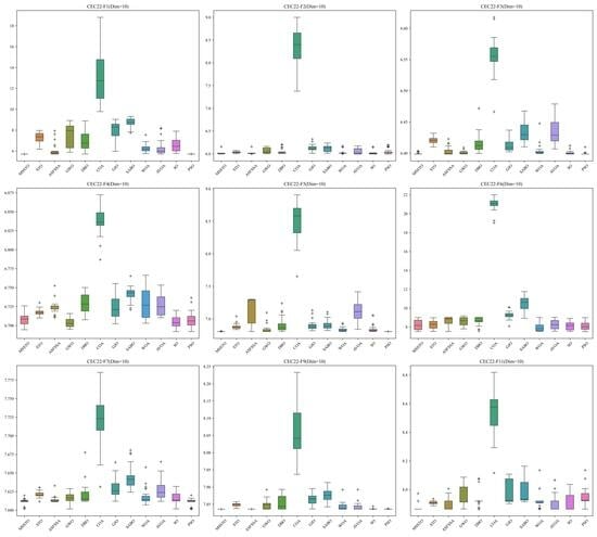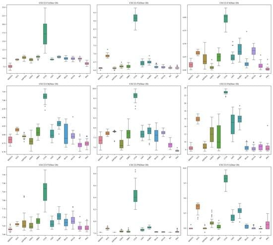 This study tested the MSSTO algorithm in 10-dimensional and 20-dimensional scenarios. Figure 8 and Figure 9 present the box plots for the 10-dimensional and 20-dimensional scenarios, respectively. The figures indicate that the solution quality achieved by the MSSTO algorithm surpasses that of the other competing algorithms on most of the test functions, and the distribution of the solutions demonstrates higher stability. The convergence curves in Figure 10 and Figure 11 reveal that the MSSTO algorithm converges significantly faster than the other compared algorithms on most test functions. This performance suggests that the MSSTO algorithm can swiftly identify superior solutions during the initial phases of the search.