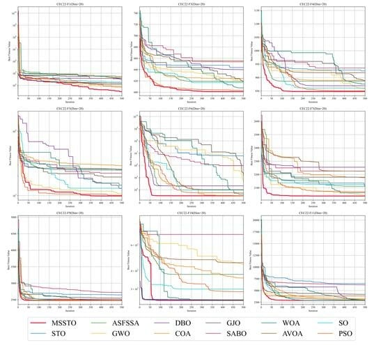 Convergence analysis of the MSSTO and competitor algorithms in CEC-2022 test suite (dimension = 20).