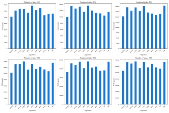 Figure 13 presents the statistical results of the completion times for different algorithms when the number of tasks is 100, 200, 300, 500, 700, and 1000, respectively. Clearly, the MSSTO algorithm outperforms all other algorithms in the comparison, exhibiting the shortest completion time. Additionally, Table 5 provides the comparison data of completion times between the MSSTO algorithm and the other compared algorithms. The calculation formula is as follows: