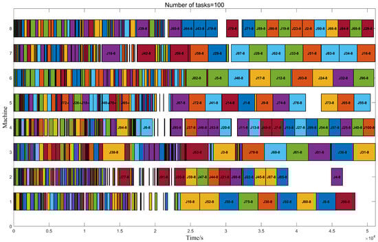 From Table 5, when the number of tasks is 100, 200, 300, 500, 700, and 1000, the completion time of the MSSTO algorithm is reduced by 15% to 22% compared to the STO algorithm. Compared to other swarm intelligence algorithms, such as PSO and GWO, the maximum reduction in completion time can reach up to 26%. Even for the better-performing WOA and AVOA algorithms, the completion time shows an improvement of 4% to 10%. These results fully demonstrate that the MSSTO algorithm has significant advantages in reducing task completion time compared to various other algorithms. Figure 14 shows the Gantt chart of the time proportion for processing 100 tasks on eight computers using the MSSTO algorithm combined with the RK task mapping strategy and the UD machine allocation strategy. Through this Gantt chart, it is possible to clearly observe the distribution and time occupancy of different processes of each task on different computers, thereby confirming the significant advantages of the adopted strategies in optimizing task processing time.