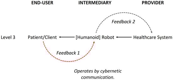 Figure 1 is a three-level healthcare interaction framework that utilizes “cybernetic communication (i.e., the Shannon–Weaver model of communication in a circular, self-regulating process) to improve healthcare delivery. It involves three agents: the END-USER (“Patient/Client”), the INTERMEDIARY (“Robot”), and the PROVIDER (“Healthcare System”). Communication flows are depicted with arrows, indicating the direction of information exchange. A solid black arrow represents the flow from the “Healthcare System” to the “[Humanoid] Robot” and then to the “Patient/Client”. Feedback loops are shown by a red dashed arrow (“Feedback 1”) from the “Patient/Client” to the “[Humanoid] Robot” and a black dashed arrow (“Feedback 2”) from the “[Humanoid] Robot” to the “Healthcare System”. Figure 1 positions the robot as an intermediary that facilitates two-way feedback and communication between patients and their healthcare providers within a network system, delivering personalized and accessible healthcare services.