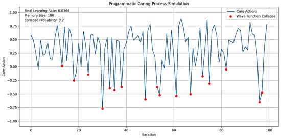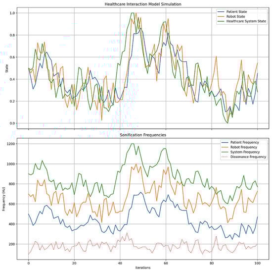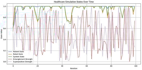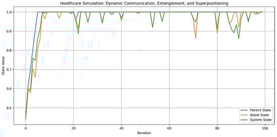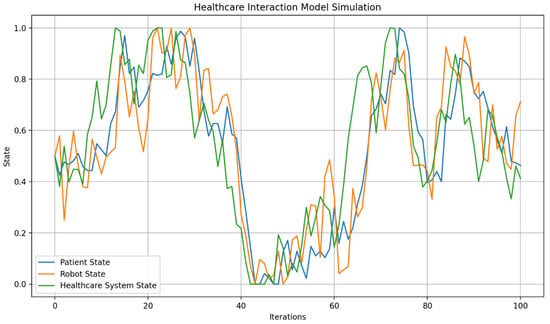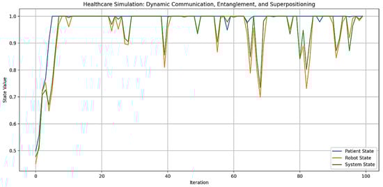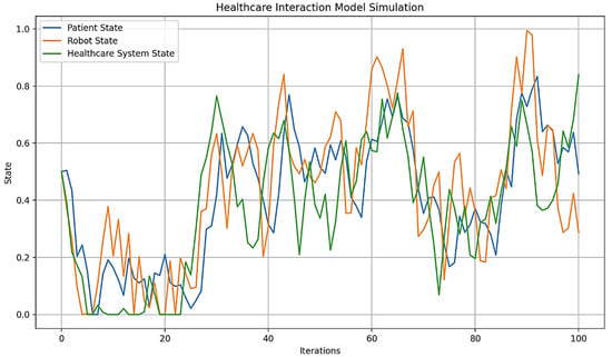 Figures 2, 6, and 10 initialize the states of the patient, robot, and healthcare system at 0.5 and run for 100 iterations to create dynamic interactions. Figure 2 simulates information flow and feedback exchanges between the healthcare system, robot, and patient, with random variations of −0.1 to 0.1 for information flow and −0.2 to 0.2 for feedback, constrained within 0 to 1. Interactions influence evolving states over time, causing unpredictability or nonlinearity. Figure 6 introduces “dynamic communication”, “entanglement”, and “superpositioning”, each influencing interaction intensity and state values in healthcare interactions. The states are also clipped to remain within [0, 1] for validity. Figure 10 includes a circular memory that stores 100 experiences, with a learning rate of 1.0 and an uncertainty threshold of 0.5, allowing the system to adapt its care actions, intentions, and outcomes based on past experiences while incorporating randomness to account for real-world dynamics. The choice of 100 iterations balances meaningful trends with computational efficiency, allowing for a robust analysis of agent interactions among patients, robots, and the healthcare system.